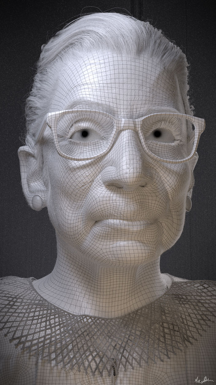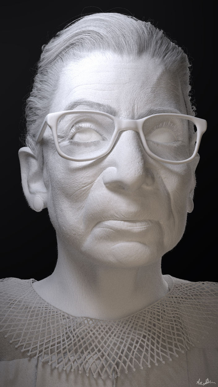 Details sculpted in zbrush, textures in Substance painter, hair grooming in xgen / maya, and rendered using Arnold. I also simulated RBG's robe in Marvelous Designer, and procedurally created the jabot texture in Substance Designer.